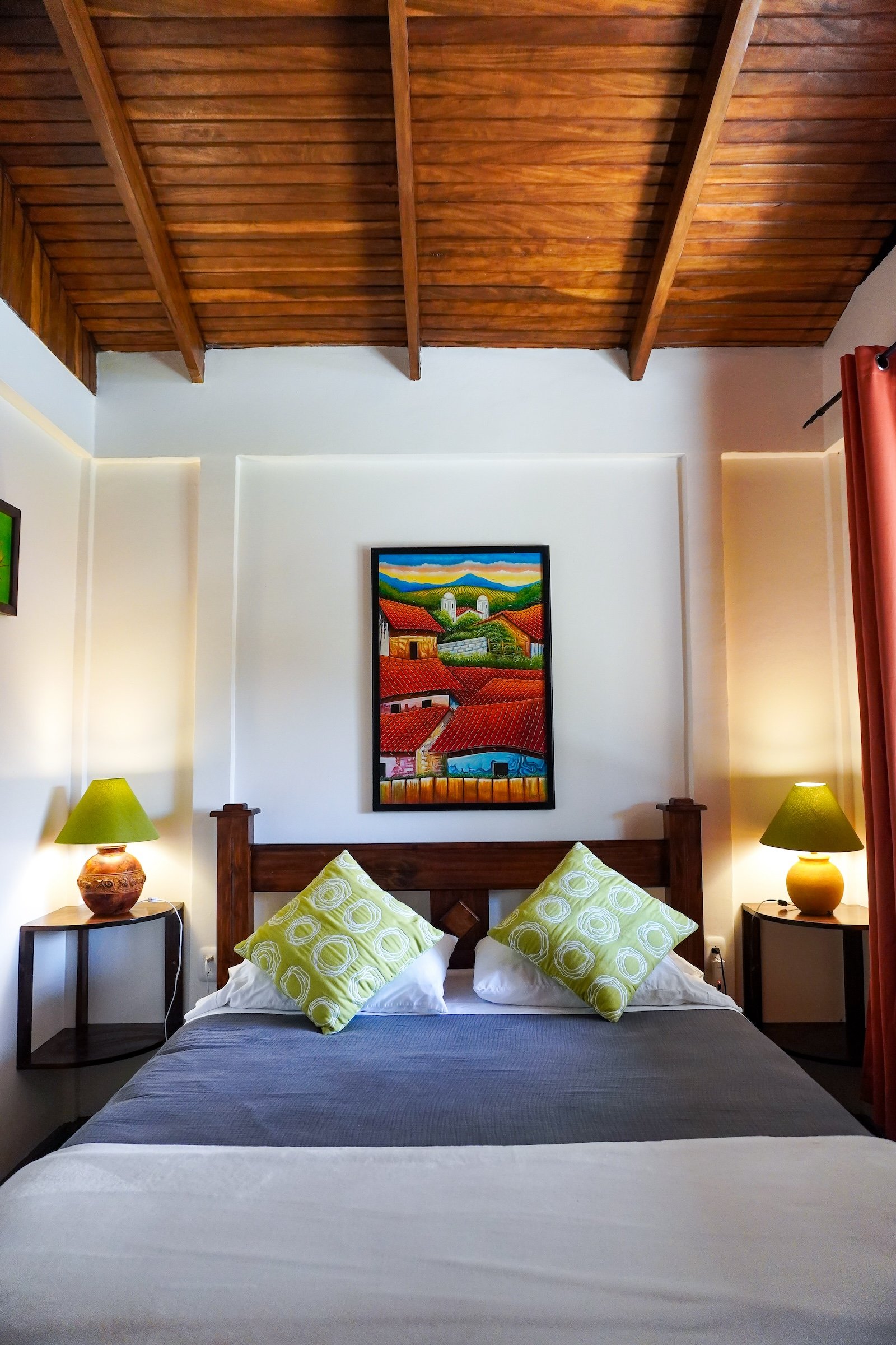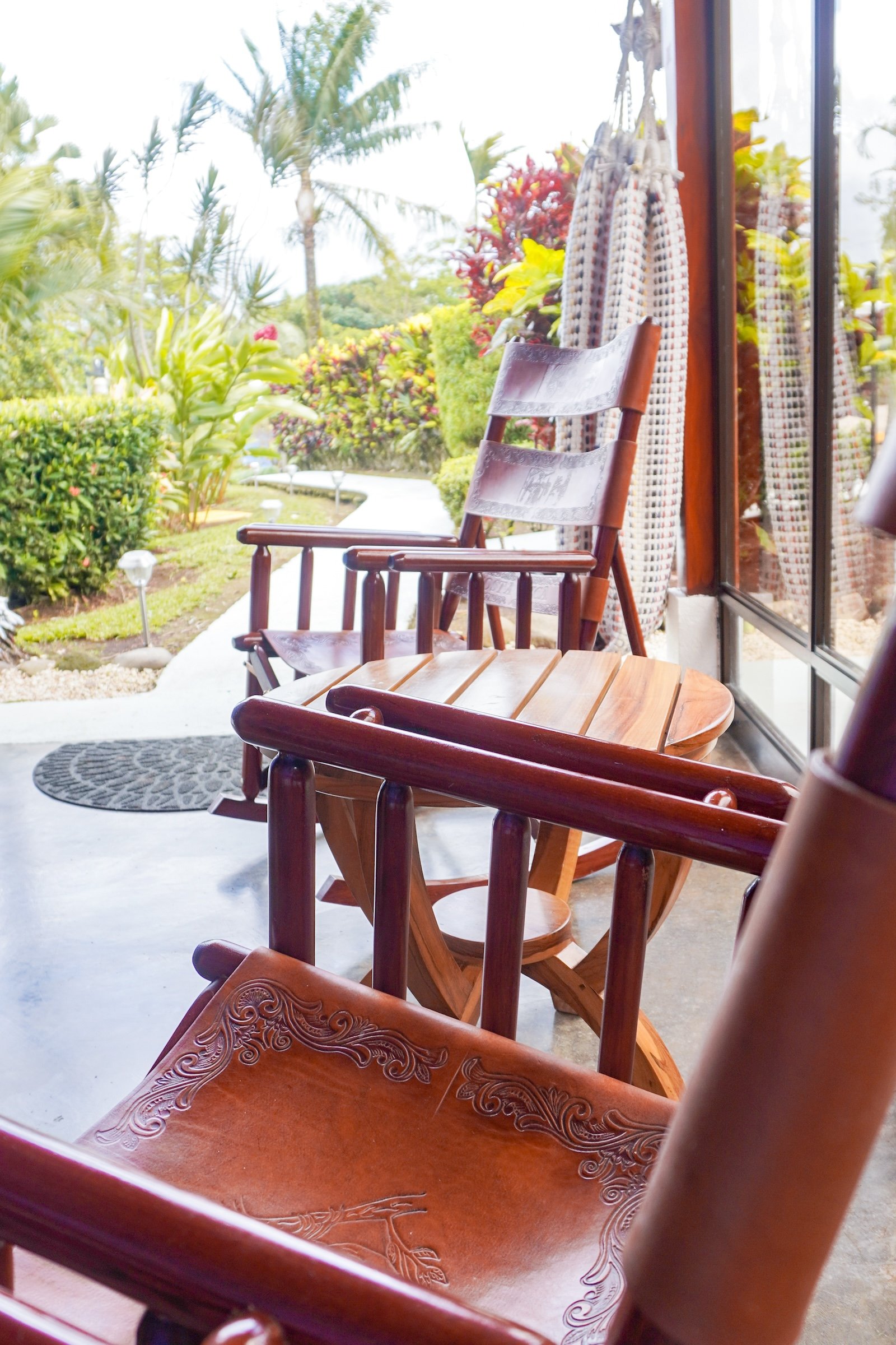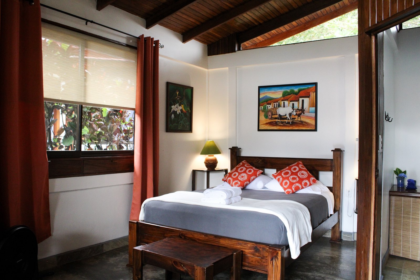 Spacious superior bungalow with garden & volcano views, features two queen beds and a roomy front patio for relaxing in nature.