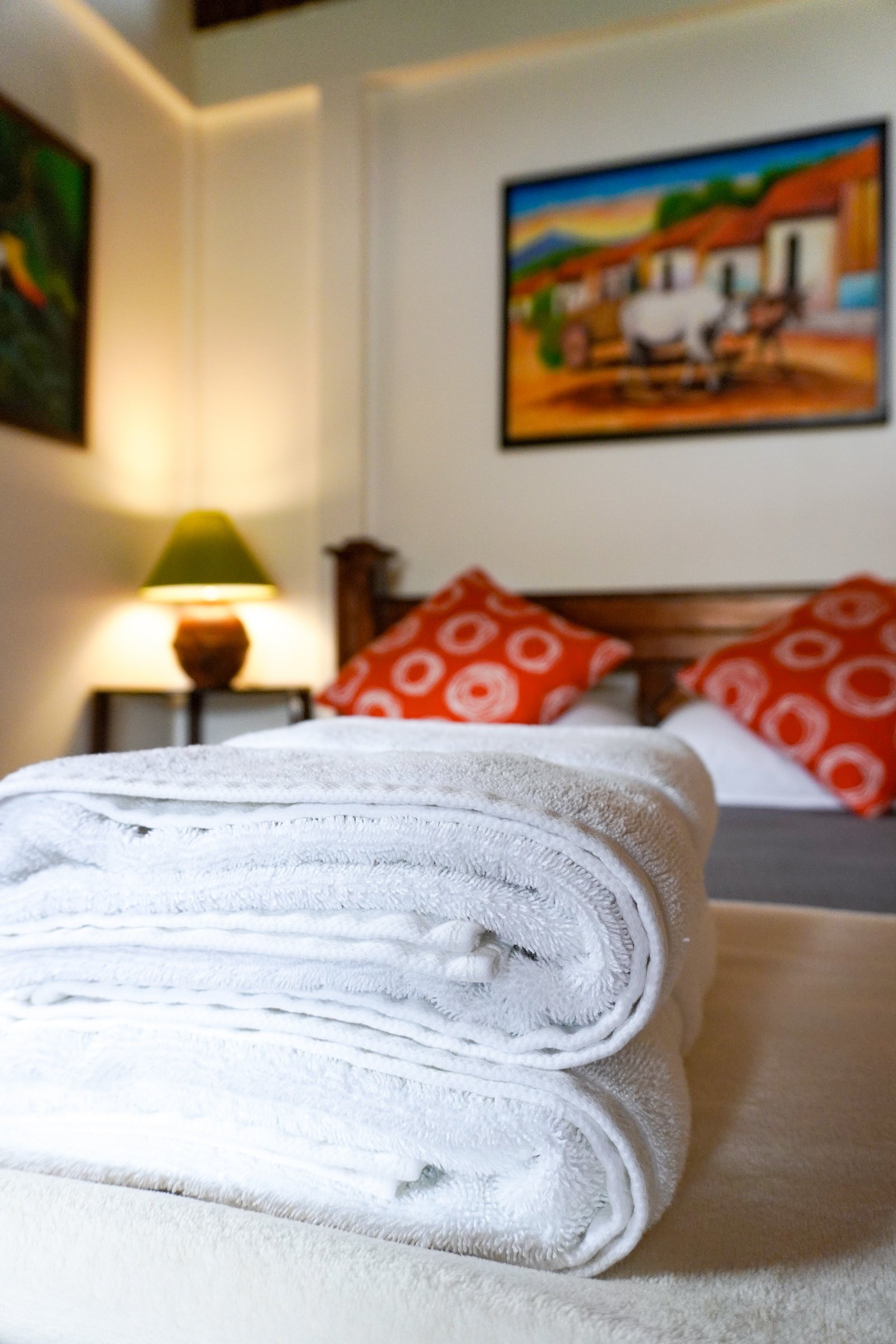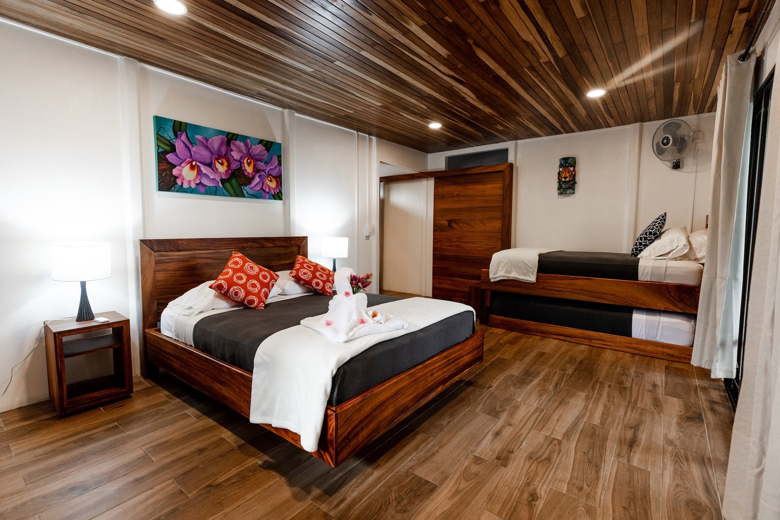 Spacious duplex-style superior room with garden & pool view patio; accommodates 3 adults or 2 adults + 2 children with 1 queen & 2 singles. Includes luxury linens, in-room espresso, aromatherapy spa products.
