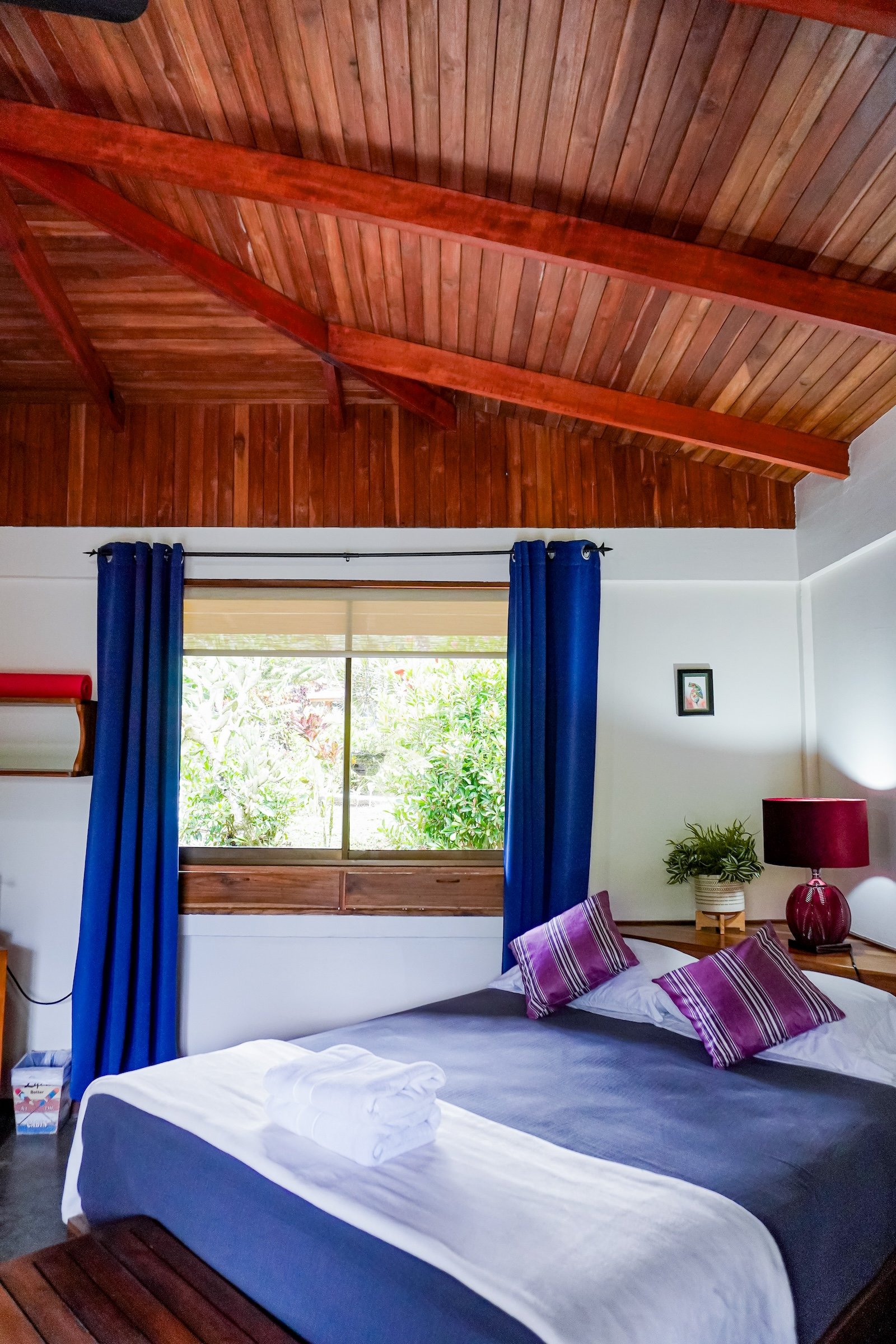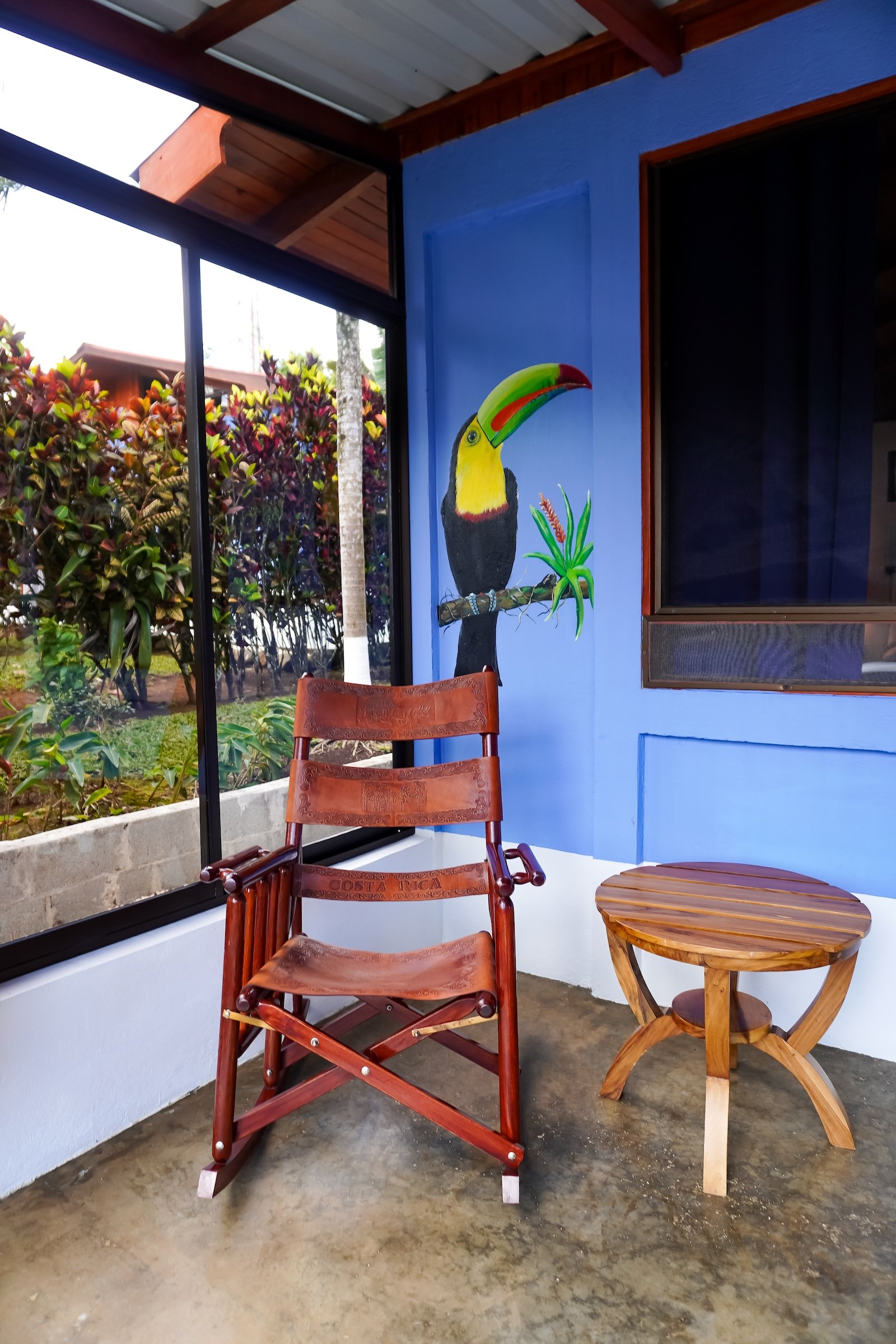 Elegant bungalow with king bed, volcano & garden views, natural stone bathroom, cozy private patio—ideal for couples seeking a romantic rainforest escape.